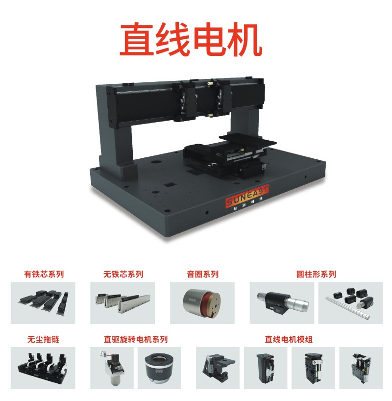 日東科技自主研發的直線電機產品系列,集高精度(100納米重復定位精度)、高響應速度、高穩定性及可靠性等優點,廣泛應用于各行業精密場合,如視覺檢測、光學校準對位、激光加工、工業機器人、精密機床等。產品采用光柵尺或磁柵等無接觸位置編碼器精準定位,可實現單軸、多軸聯動,龍門同步等快速靈活的驅動控制,維護方便,使用壽命長,同時緊湊的模塊化設計節省了安裝空間,易于擴展。