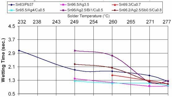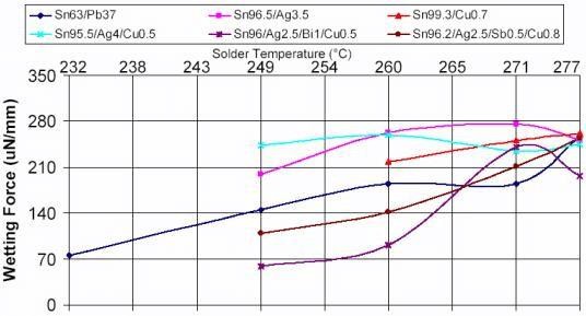 波峰焊的溫度并不等于錫爐溫度,在線測試表面,一般焊接溫度要比錫爐溫度低5℃左右,也就是250℃測量的潤濕性能參數大致對應于255℃的錫爐溫度。通過實驗表明,一般的無鉛釬料合金,最適當的錫爐溫度為271℃。此時常用的無鉛合金一般存在最小的潤濕時間和最大的潤濕力,如圖5-27所示。當采用不同的助焊劑時,無鉛釬料潤濕性能最佳錫爐溫度有所不同,但是差別不大。