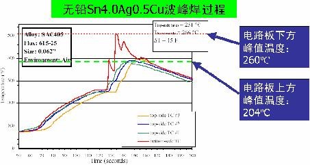 對于Sn-0.7Cu釬料合金+無鉛專用助焊劑/低VOC助焊劑組合而言,焊錫槽的最佳溫度為260-270℃;復合雙面板一般要比單面板溫度高10~25℃左右;無鉛波峰焊中最好使用Tg高的基板材料,因為其有更好的阻抗能力。無鉛波峰焊對于元器件影響不是很大,圖5-28為SAC405釬料在焊接溫度下對不同測試點溫度的測試數據,可以看出幾條曲線溫度相近。