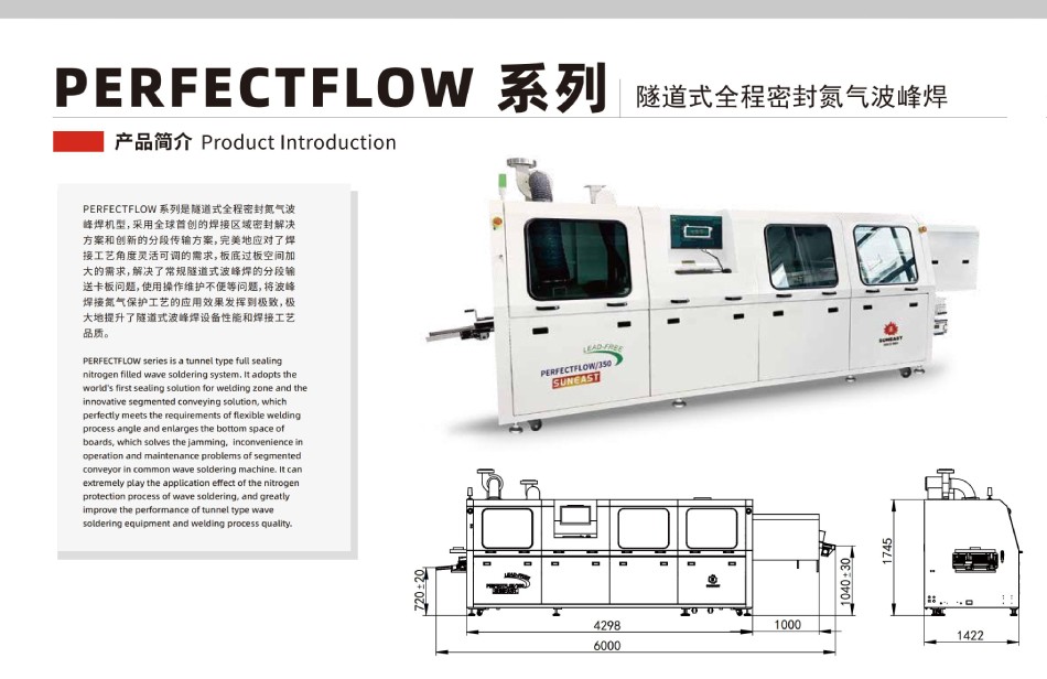 PERFECTFLOW 系列隧道式全程密封氮?dú)獠ǚ搴福捎萌蚴讋?chuàng)的焊接區(qū)域密封解決方案和創(chuàng)新的分段傳輸方案,完美地應(yīng)對(duì)了焊接工藝角度靈活可調(diào)的需求,板底過板空間加大的需求,解決了常規(guī)隧道式波峰焊的分段輸送卡板問題,使用操作維護(hù)不便等問題,將波峰焊接氮?dú)獗Wo(hù)工藝的應(yīng)用效果發(fā)揮到極致,極大地提升了隧道式波峰焊設(shè)備性能和焊接工藝品質(zhì)。